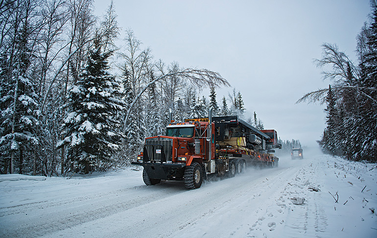 Back in Yellowknife, we borrowed a satellite radio from a friend, and at the chain-up station, we set it to the frequency of the road. Right away comes a voice from the static: “Wide load at Dam Creek,” says a wide load, presumably at Dam Creek. “And there’s a nice little hole at the bottom here, that’s an axle-breaker.”