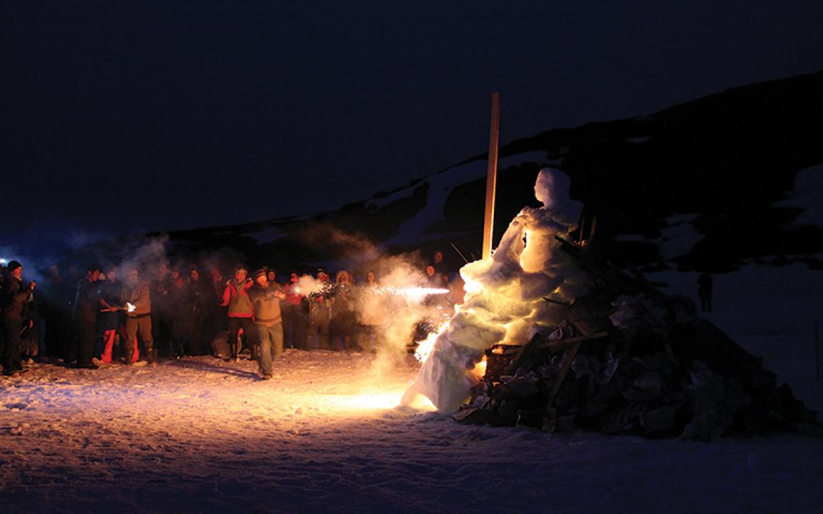 The theme is Return of the Melting Man, the name of the snow effigy who is destined to return to the ice from which he was made. Around midnight, a trio of fire dancers come out swinging before the contents of a bright red jerry can are poured over the slats of wood between the Melting Man’s legs. An archer (yes, an archer) draws his bow back, takes aim and lets fly a flaming arrow. Miss. He tries again. Miss. And again. Miss. A roman candle eventually does the trick, and the Melting Man is engulfed in a roaring fire beside us, on the bay frozen thick with six feet of ice.
