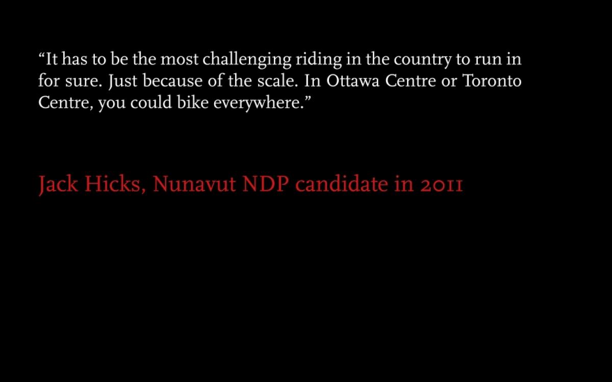 “It has to be the most challenging riding in the country to run in for sure. Just because of the scale,” says Jack Hicks, who ran in Nunavut for the NDP in 2011 but came in third to the Liberal’s Paul Okalik and the victorious Conservative Leona Aglukkaq. “In Ottawa Centre or Toronto Centre, you could bike everywhere.”