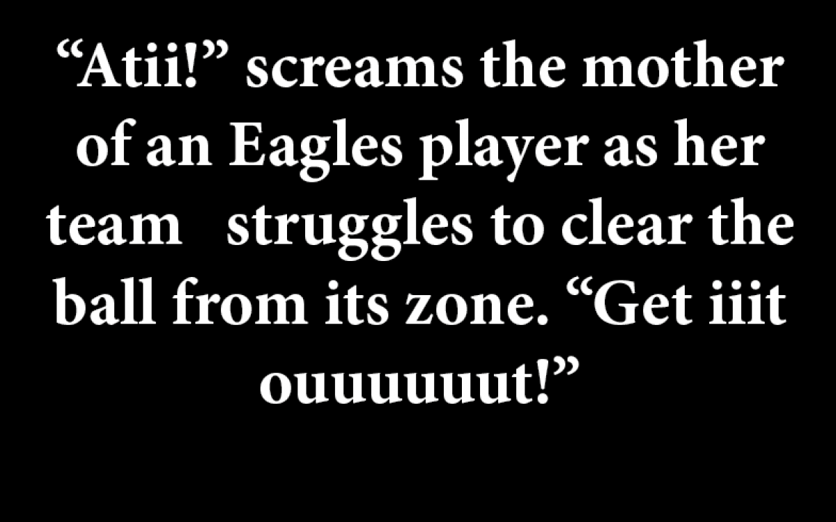 “Atii!” screams the mother of an Eagles player as her team struggles to clear the ball from its zone. “Get iiit ouuuuuut!” The Eagles turn the ball over and Lutsel K’e gets a shot on net.