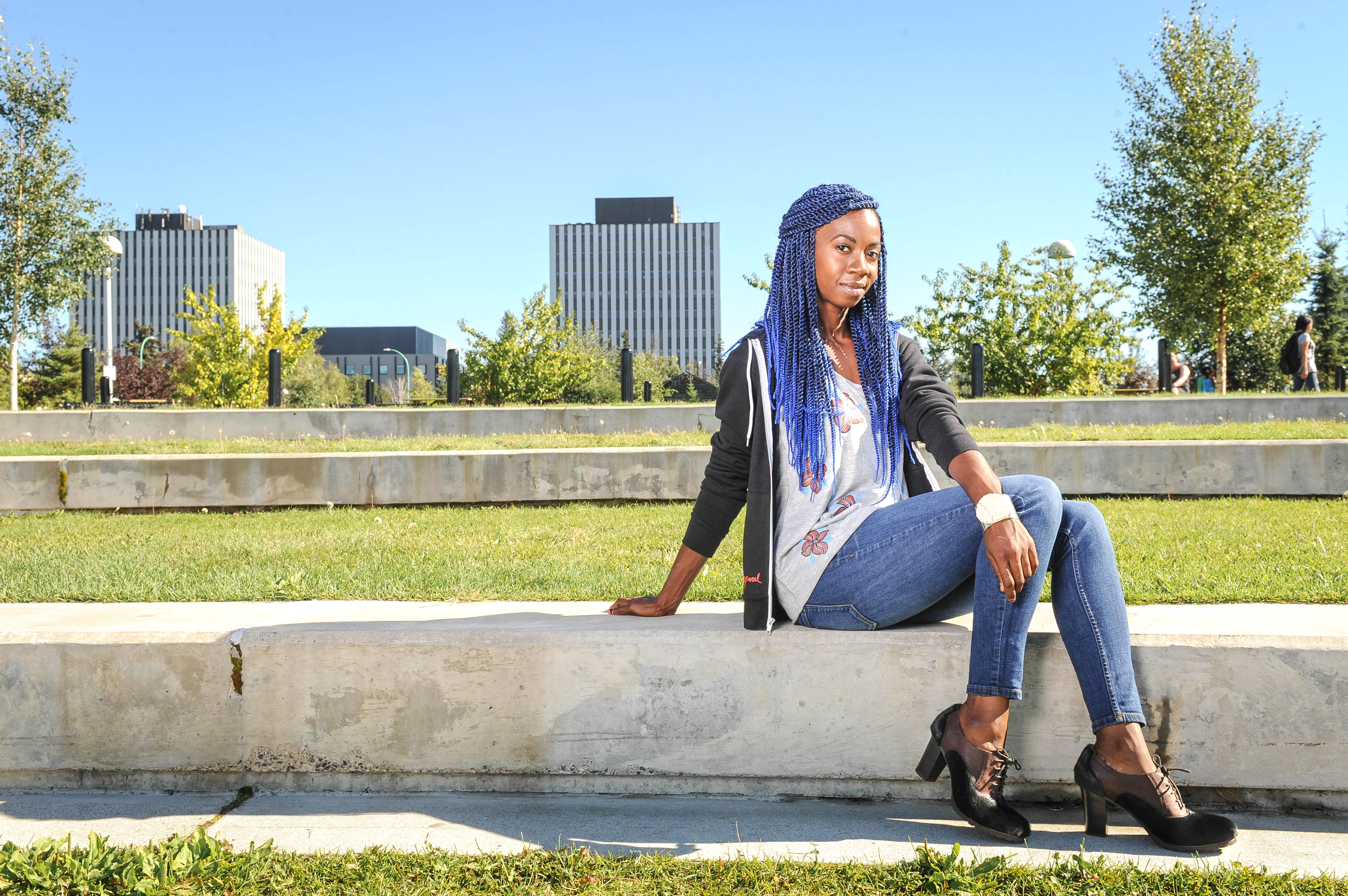 With makeup by Nicole Garbutt Makeup Artistry, model Inemesit Essien Graham wears a sweater and tank top by Erasmus Apparel, whale vertebrae cuff and earrings by Ugly Fish and sealskin heels by ENB Artisan.