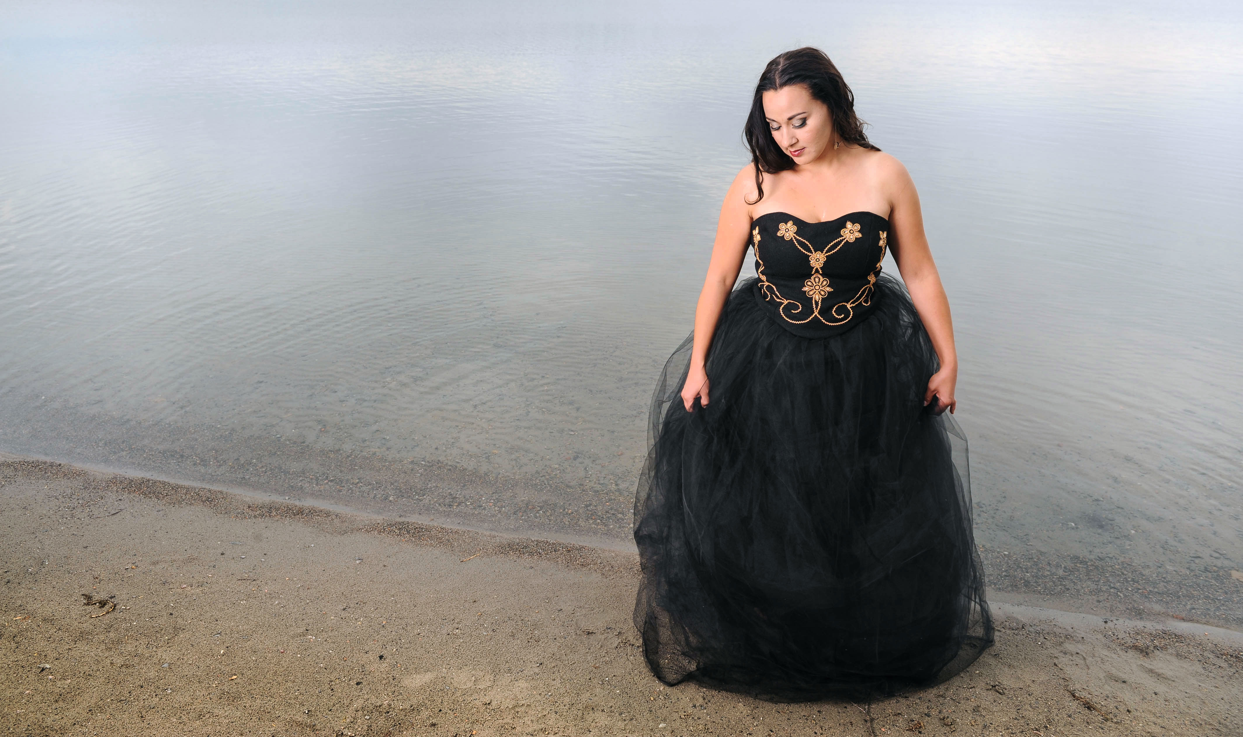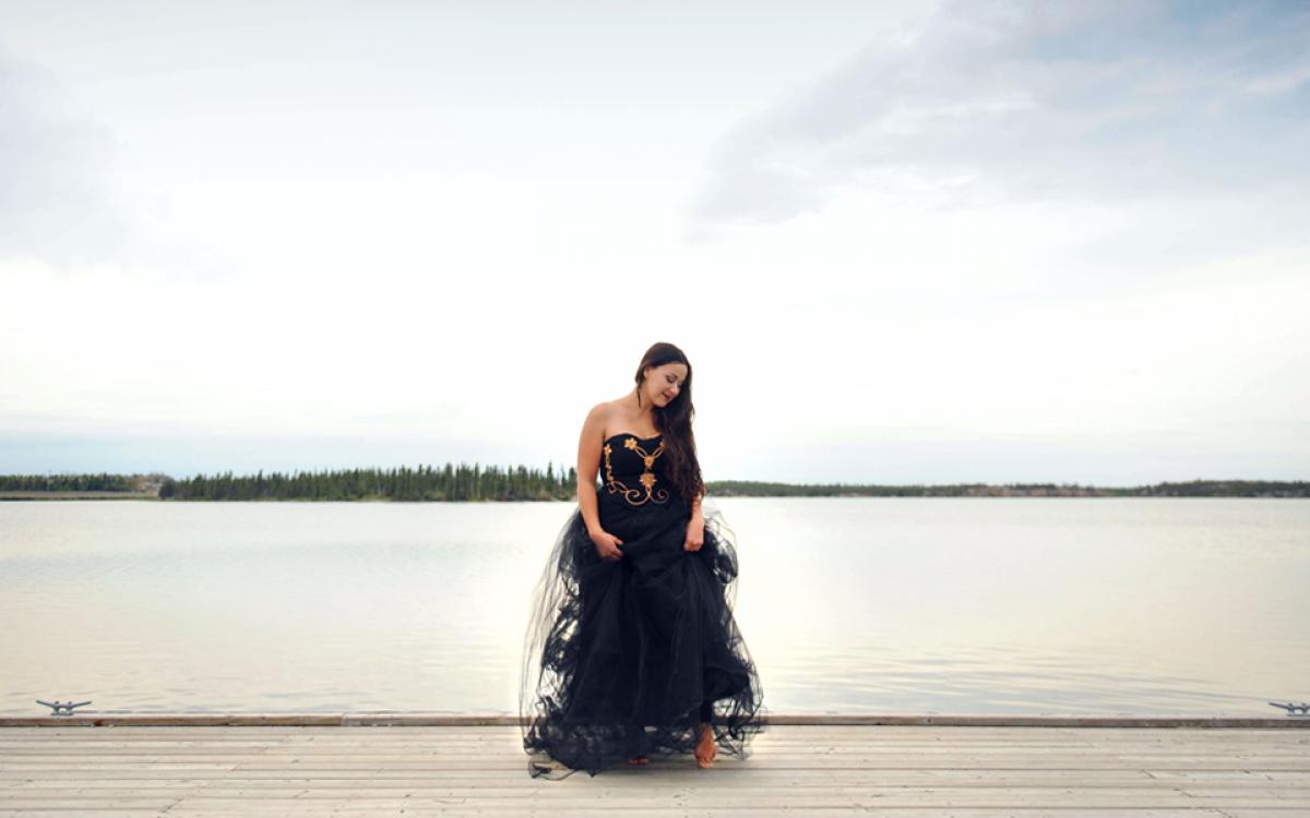 Model Kayley Mackay wears black dress with gold beads and fishnet skirt by Six Red Beads, along with muskox horn earrings and necklace by SavageSalvage.
