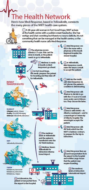Since 2014, Med-Response has been the nerve centre for the Northwest Territories’ health system. The majority of NWT communities aren’t accessible by all-weather road and even fewer communities have physicians or the facilities required to respond to medical emergencies. That means air ambulances link patients with medical care at regional health centres, the Inuvik Regional Hospital, the larger Stanton Territorial Hospital in Yellowknife or, in the most serious cases, hospitals in Edmonton. Med-Response connects the many moving parts.The call is an update from Air Tindi, which has the medevac contract for the NWT.