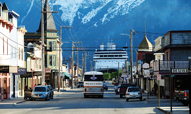 Andy, our driver and guide, wore clip-on shades on his glasses, a light-blue long-sleeved shirt and a navy blue tie. He was tall and lean, a surfer from Seattle who’d lived most recently in California, and he’d been driving for Holland America for seven summers before this one; even before he got the driving gig, he’d been coming north to work in a cannery. “I just keep coming back like the salmon,” he said. He was joined at the front of the bus (or “motorcoach,” as we were reminded, which I supposed was a branding effort meant to keep us from thinking too hard about rattletrap school buses) by David, our tour director, a sort of onboard concierge who would handle the logistics of our arrivals and departures, our hotels and tour bookings in town.