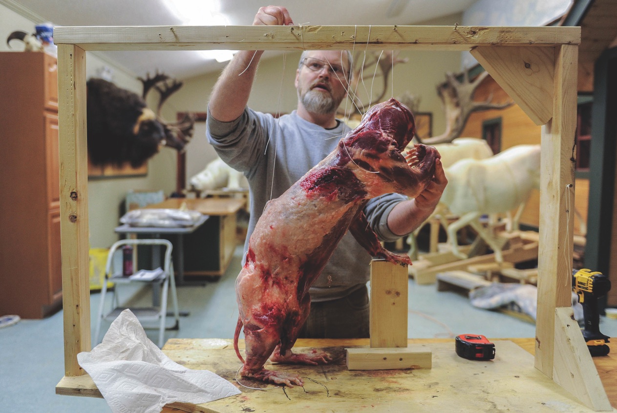 It’s a testament to the patience of Greg Robertson’s parents that he enjoys a worldwide reputation as a taxidermist. “They were very supportive of my... messy hobby,” says Robertson, noting that they once gave him five whole Arctic foxes—his best Christmas present ever. That was back in the 1980s, when Robertson was a teenager toiling away in the basement of the family home during his spare time. Today, he is famous as the founder of Robertson Taxidermy Ltd., operating out of a shop in Yellowknife’s Kam Lake neighbourhood, where he produces mounts for clients ranging from sport hunters to international museums. His trademark skill? Creating lifelike scenes that depict the life of his subjects as well as their habitats and behaviours. One of Robertson’s best-known pieces greets visitors at Yellowknife’s airport—a depiction of a polar bear on an ice floe, mid-stride, chasing a seal as it escapes down a breathing hole.
