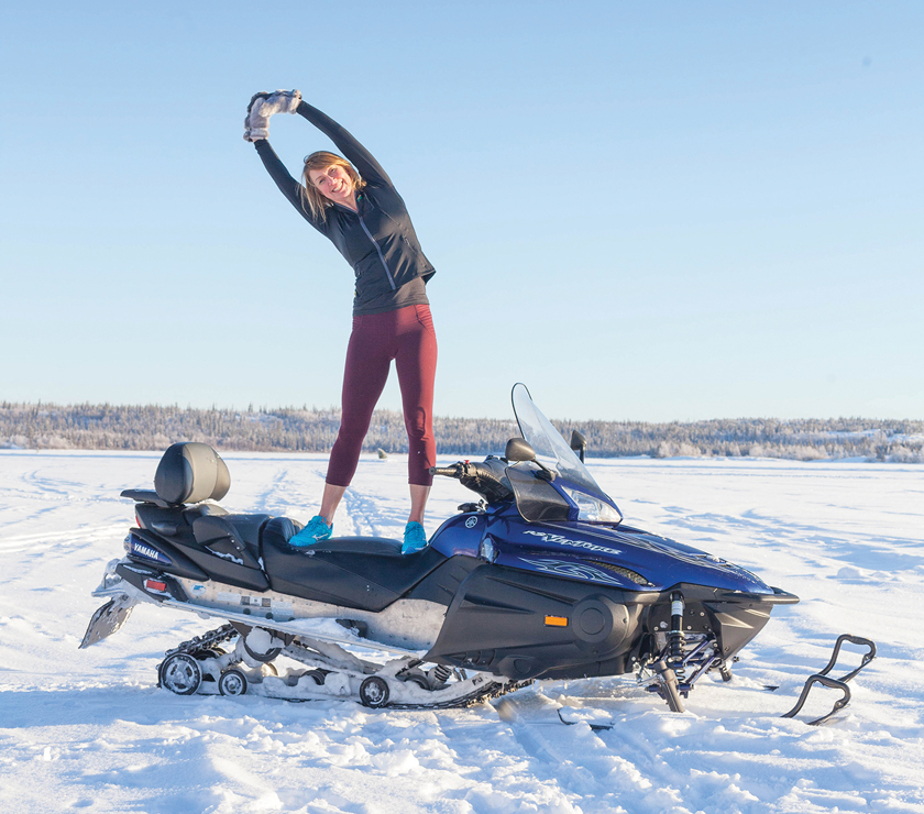 1) Stand on top of your snowmobile with your feet shoulder-width apart. You can stand on the ground too, but the view down there isn’t as cool.