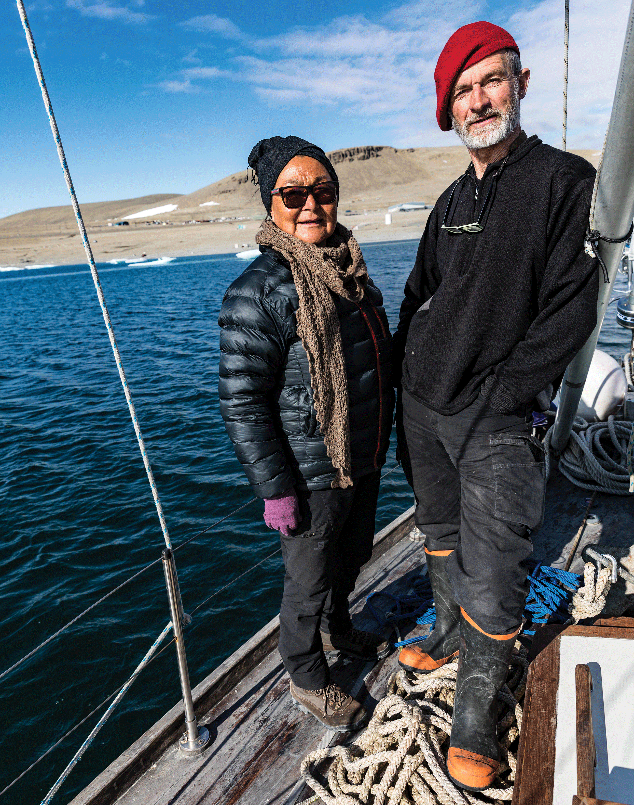 Sleeping aboard their boat, they took the dingy ashore during the day to visit with people in the community of 200. They would spend the next 18 days in Resolute, but they took the delay in stride. They made friends and they learned about the local culture and history. “When we entered Allie and Susan Salluviniq’s home, they handed me the ulu, and told me to have some frozen Arctic char,” Dorthe says. It’s a common dish in Greenland, as is the dried beluga whale skin the Kjeldsens also ate in Resolute.