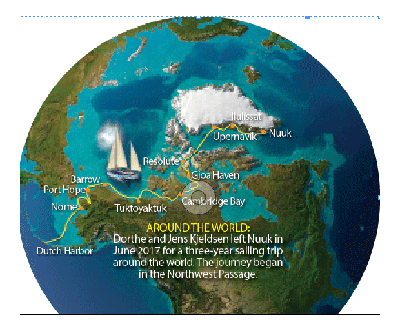 But the filmmakers weren’t there to capture the dramatic landscapes, even as the foursome motored out of the harbour, leaving the rocky shore peppered with the bright red, yellow, and blue houses of Aasiaat behind them. They were following Dorthe and Jens, both in their 60s, as they embarked on a three-year round-the-Earth trip that would take them through the Northwest Passage, then across the Pacific Ocean to Hawaii, and onwards to Southeast Asia, Africa, the Caribbean and back to Greenland.